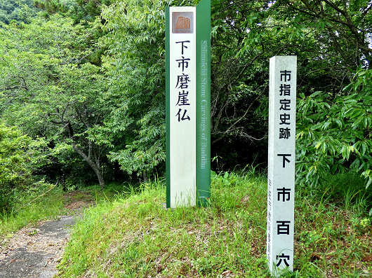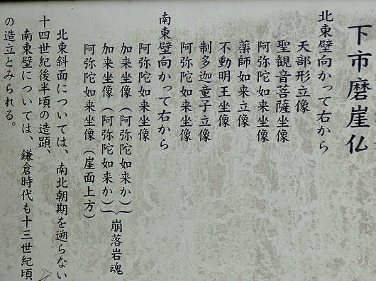 鳥居の前には「下市摩崖仏」の説明板がありました。これによると鳥居を潜った先の北東壁には7体の摩崖仏が、そして鳥居の左側の下市百穴のある南東壁には4体の摩崖仏があるようでした。