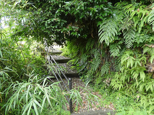 下市百穴の入口付近は道もはっきりしていましたが、先に進むと雑草や樹木がうっそうと繁っていて、腰をかがめないと前へ進めないほど木の枝が歩道に覆いかぶさっていました。