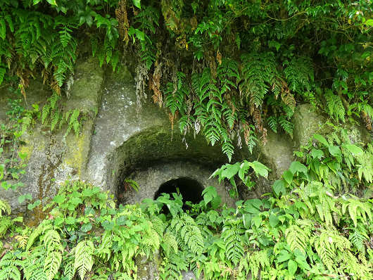 頭上に伸びた枝を払いながらようやく横穴式古墳の「下市百穴」へ着きましたが、ここも雑草が繁っていて古墳はほとんど見えませんでした。以前ここを訪れた時には雑草は全く無くて、岩壁にはズラリと横穴式古墳が並んでいるのが見えたんですよね。