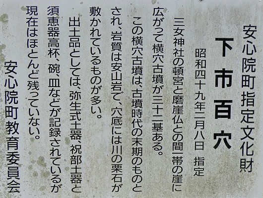 下市百穴の説明板です。これを読むとここには横穴古墳が32基あると書かれていましたが、この時見れたのはわずか数基だけでした。