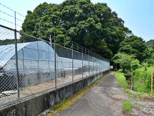 河川敷に車を停めたら、スッポン養殖場横の道を奥にあるこんもりと樹木が繁った森に向かって歩きました。