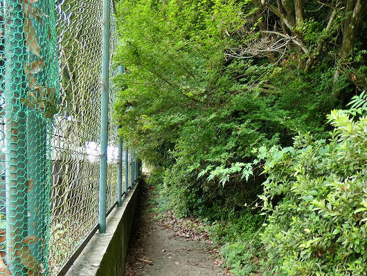 鳥居の前から南東壁を眺めると、壁面は樹木などに覆われていて、摩崖仏は全く見ませんでした。以前ここを訪れた時にはこの狭い通路が下市百穴まで続いていて、摩崖仏も下市百穴もここから見れたんですよね。