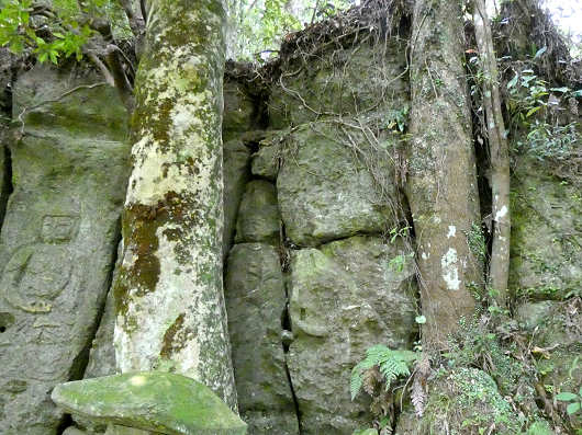 摩崖仏の彫られている岩壁の前には大きな木も茂っていて、幹の向こう側にも摩崖仏があるような感じでしたが、岩壁にピッタリとくっつくように幹が成長していたの、全く見ることができませんでした。