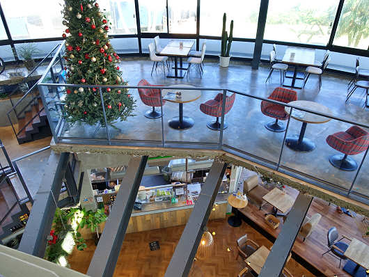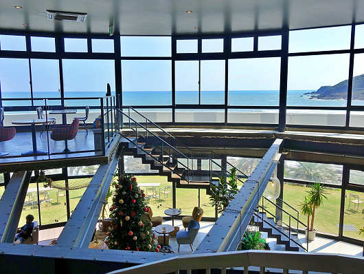 2階からは屋上に続く階段があって、階段の途中から下を眺めたらこんな感じでした。建物全体が吹き抜けのような構造になっていて、大きな窓際にはテーブル、イスが配置されていて、雄大な太平洋(日向灘)を眺めながら食事ができるようになっていました。こんなところで食事をしたら何を食べても美味しいでしょうね。