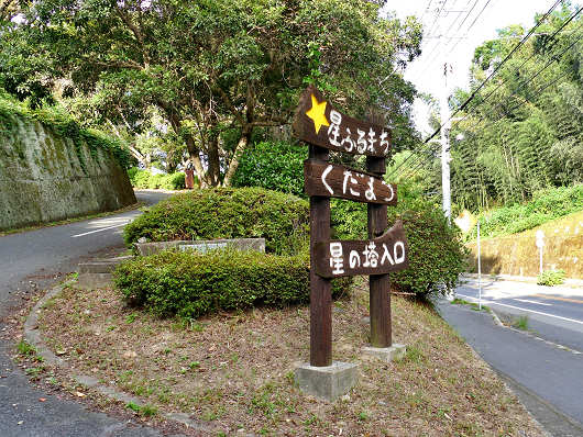 下松駅から不思議な形の塔が建っている丘へ向かって1.5kmほど走ると「★星ふるまち くだまつ 星の塔入口」と書かれた標識が見えてきたので、ここを左折して狭い道を登って行きました。下松駅前から見えていた不思議な形の塔は「星の塔」というようですね。