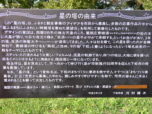 ここには「星の塔」の由来についての説明板もありました。内容は金輪神社で見た「鼎の松」と同じように北辰星伝説について書かれていましたが、この塔は高さが19mもあるんですね。