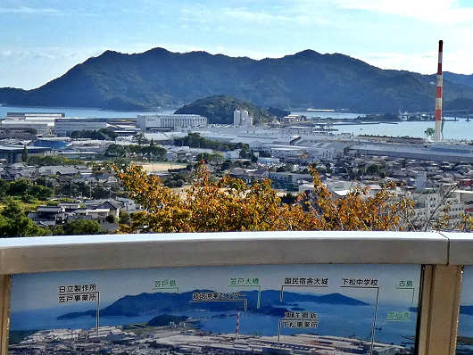 展望台の手摺?部分には、ここから見えている景色と同じ写真があって、主な施設や島などには名前が書かれていて、景色と見比べられるようになっていました。
