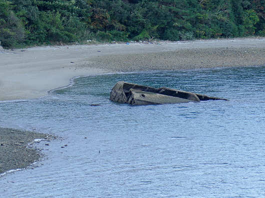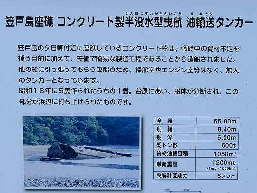 説明板を読んでみると、この不思議な形をした物体は戦時中に造られたコンクリート製の船で、台風によって浜辺に打ち上げられと書かれていました。コンクリートで船を造っても海に浮かぶんですね。