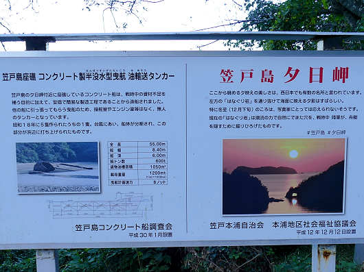 展望所には説明板も立てられていて、ここは「笠戸島 夕日岬」というようでした。そして説明板にはこの不思議な物体についても書かれていました。笠戸島は当初の計画では訪れる予定が無かったところなので、これらについては事前に何も調べてなかったんですよね。