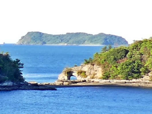 展望所からは遠くの景色も何枚か撮影したので、どこかに「はなぐり岩」が写ってないかと探してみると、一枚だけポッカリと穴の開いた岩が小さく写っていましたが、画像を拡大したらボケボケでした。