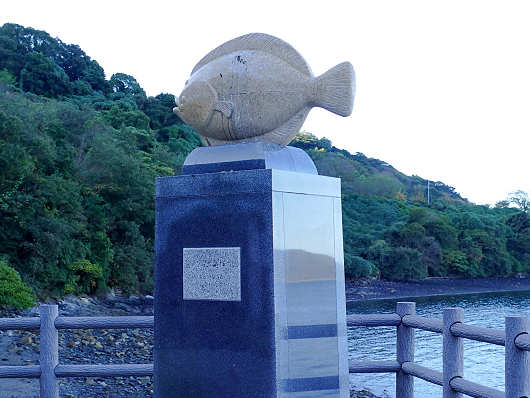 海上プロムナードの行き止まりは東屋のある広場になっていて、ひらめの供養塔が建っていました。笠戸島で養殖されているブランド魚の「笠戸ひらめ」は肉厚の引き締まった身が特徴で、「笠戸のとらふぐ」と並んで下松市の特産品になっているそうです。