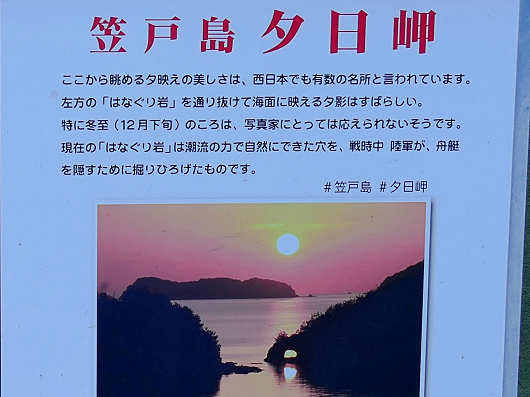 そして説明板のもう一方の夕日岬については、この時は夕日の見れる時間帯じゃなかったので全く読まずに、帰ってから画像の整理中に何気なく読んだら「はなぐり岩を通り抜けて・・・」と書かれていました。その場で説明板を読んでいたらこの「はなぐり岩」を撮影したんですけどね。