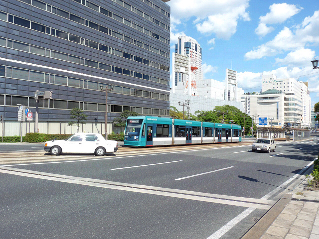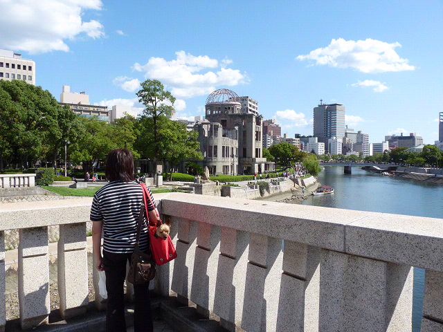 これから相生橋を渡って平和記念公園へ行きます、かっこいい電車が走ってるよね、そういえばもう一つの被爆地長崎でも路面電車が走ってたよね、