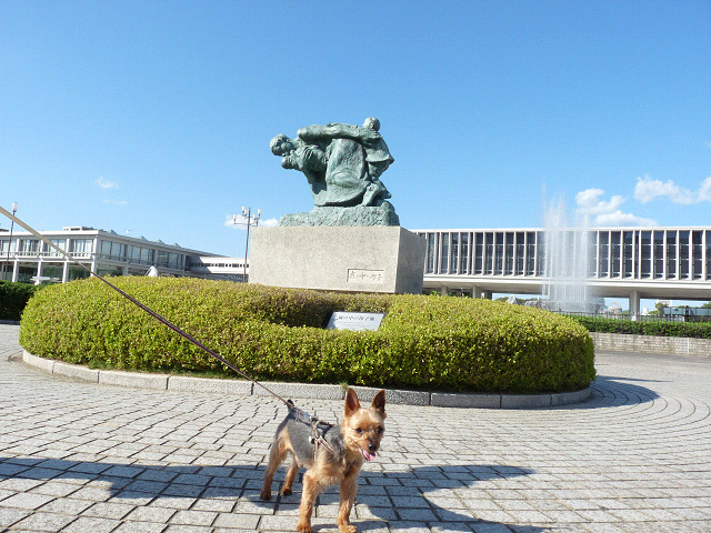 ここを出発する前に平和記念公園の正面へ来てみました、後ろにあるのは 『嵐の中の母子像』 だよ、右手に乳飲み子を抱え、左手で幼児を背負おうとしている母親の姿です、なんだか感動的だよね。