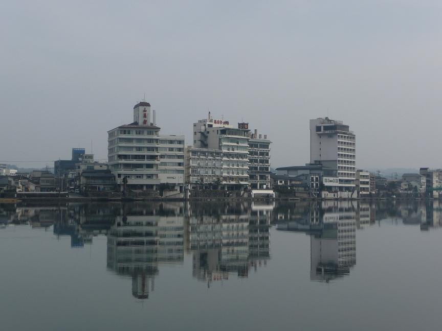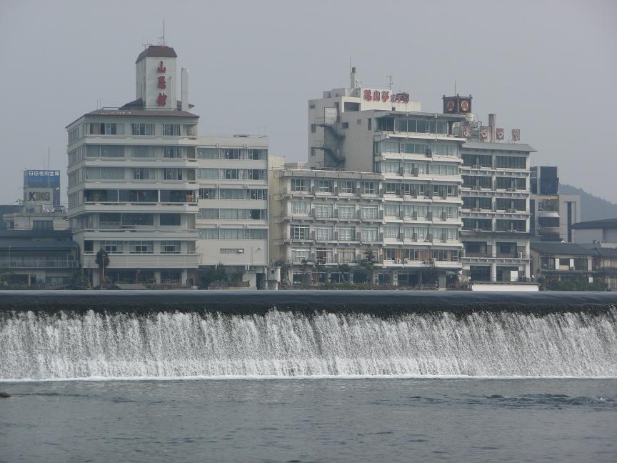 近づいてみるとこんな感じです、日田温泉の旅館街みたいです。水の上に浮いてるみたいでとても不思議な光景です。