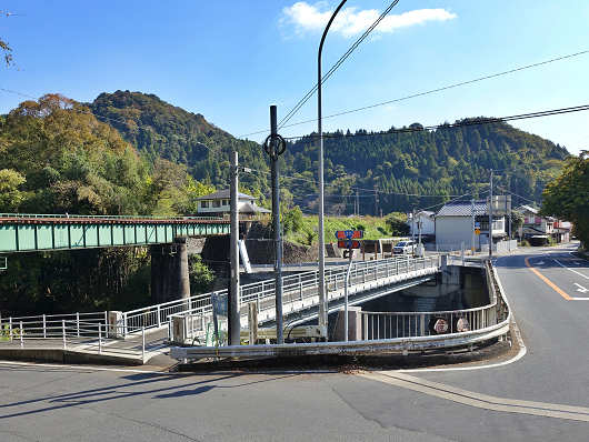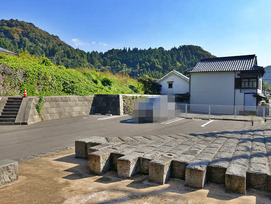 この三差路には「石橋広場」という数台の車が停められる駐車場があるのでここに車を停めました。ここにはかつて「大肥橋(おおひばし)」という石橋があったそうで、駐車場の手前にモニュメントのように並べられている石は撤去された大肥橋の一部だそうです。
