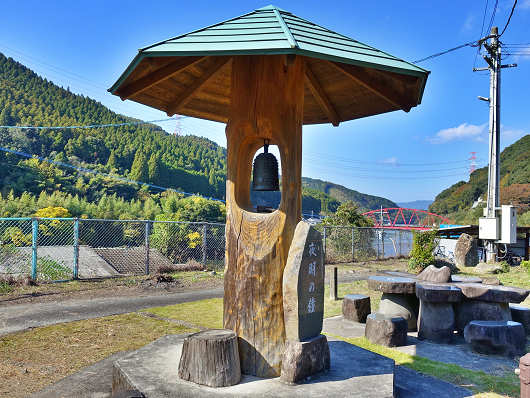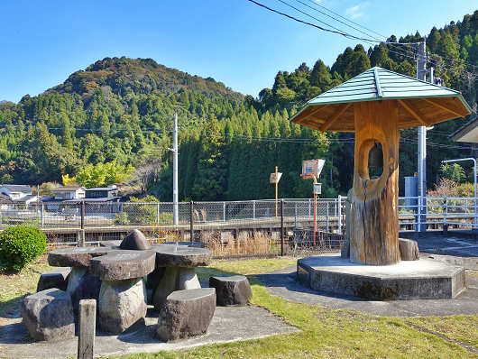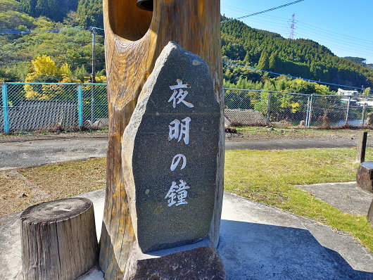 これは「夜明の鐘」といって駅舎内にあった説明板によると、136年の歴史に幕を閉じて廃校となった「夜明小学校」で、90年間に亘って夜明地区を守り続けた鐘だそうで、鐘の吊るされている木材は樹齢100年の日田杉を使っているそうです。