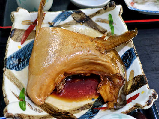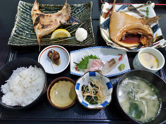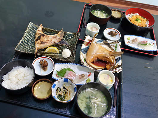 そしてこちらは私の注文した「ブリブリ定食」です。ブリかまの煮付け、塩焼きの他には刺身、バイガイの煮物、茶碗蒸し、小鉢、味噌汁が付いていました。
