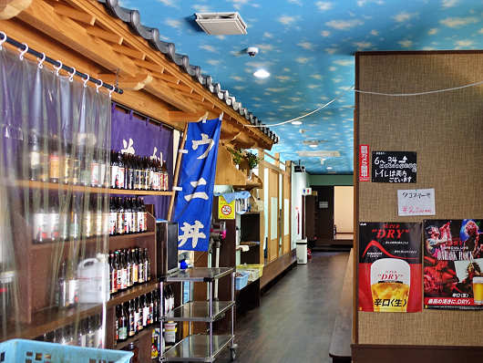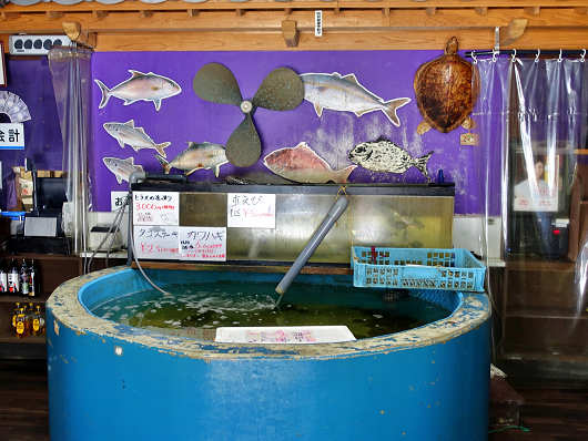 ここは初めて訪れるお店ですが、天草方面へ出かけた時にいつも気になっていたお店で、今回は天草に着いてから予約なしで訪れたんですよね。20台以上は停められそうな広い駐車場に車を停めたらさっそく店内へ入りました。扉を開けると正面には生簀があってヒラメなどがたくさん泳いでいました。