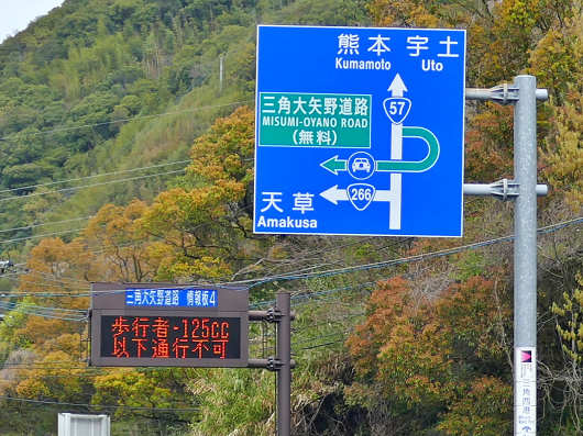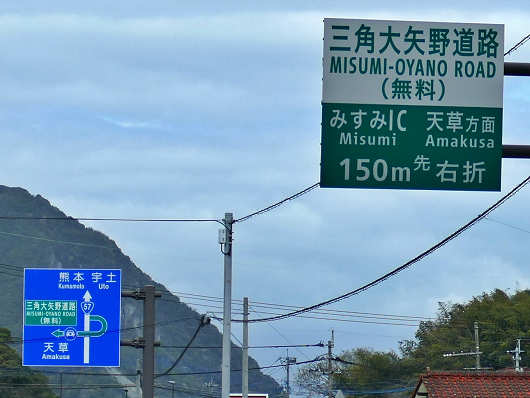 国道266号経由で天門橋を渡るルートへは左折せずに、そのまま国道57号方面に少し進むと、すぐに「三角大矢野道路」と書かれた標識が見えてくるので、ここを右折して今走って来た道路の上を大きく回って天城橋へと向かいました。
