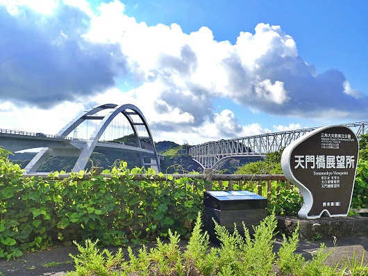 今回は2018年に開通したばかりの「天城橋」の周辺をじっくりと見物する予定でしたが、この時は雨模様の生憎の天気でうまく撮影ができなかったので以前訪れ時の画像を載せます。この画像は三角西港から撮影した天城橋の大きなアーチとその向こうに見える天門橋です。