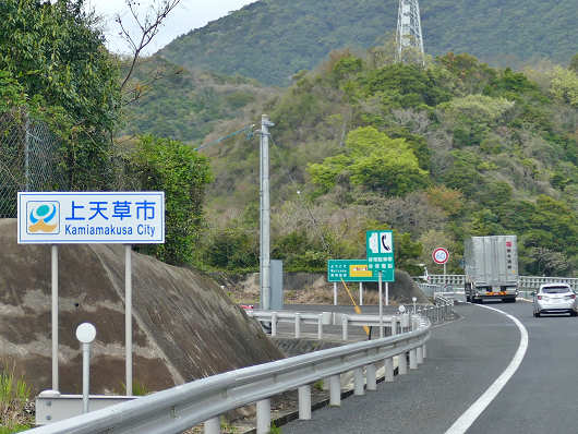 天城橋を渡り終えたら道路沿いに標識が見えてきました。ここはもう天草諸島の大矢野島で熊本県上天草市になるんですよね。