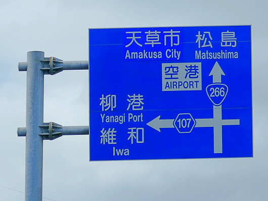 三角東港は宇土半島の先端部の近くなので、国道266号を数百mも進むとこの様な標識が見えてきます。宇土半島から天草諸島へ渡るには二つのルートがあって、ひとつは国道266号を通って天草五橋一号橋の「天門橋」を渡るルートですが、今回は新たに架橋された新一号橋の「天城橋」を渡って天草諸島へと向かいます。