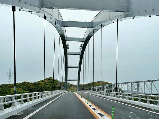 当初の計画ではお宿をチェックアウトしたら、もうしばらく天草諸島の観光をする予定でしたが、雨は一向に止む気配が無かったので、早めに天草を後にして熊本市内へ向かうことにしました。この画像は前日も渡った九州本土と天草諸島を結ぶ天城橋を渡っているところです。