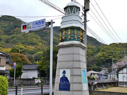 国道57号へ出て1.5kmほど走ると「三角西港」の標識が見えてきたのでここに車を停めました。三角西港は明治20年に開港した明治三大築港のひとつで、灯台のモニュメントに描かれている人物はオランダ人技師で三角西港を設計したローウェンホルスト・ムルデル(ムルドル)です。
