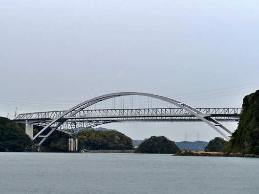 天城橋を望遠で撮影するとこんな感じで、一見するとひとつの橋のように見えますが、手前のアーチ橋が天城橋で、並行するように横一直線に鉄骨を組んだ橋が昭和41年に開通した天草五橋一号橋の天門橋です。