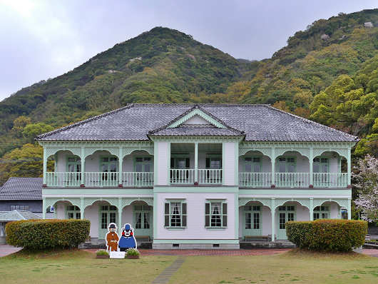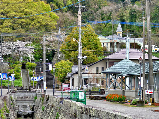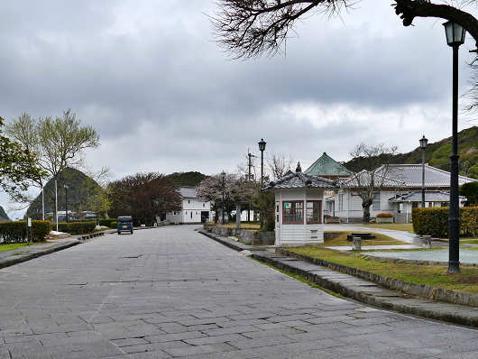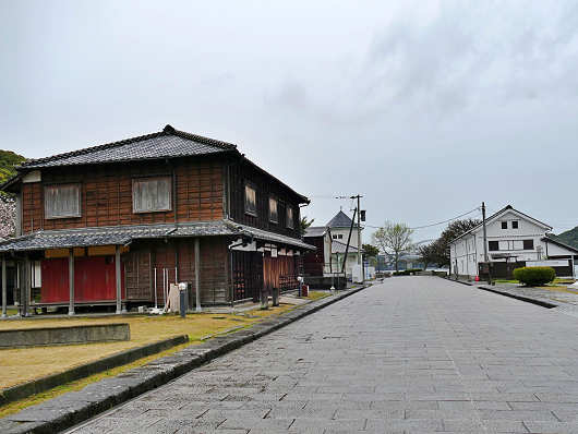 しばらく石畳の道を歩いて、木造家屋の旧高田回漕店の建物が見えてきたらここから駐車場へ引き返しました。今回は雨の天気だったので早々とここを出発しましたが、天気が良ければ国道57号を渡った山の中腹にある三角西港全体が見渡せる展望台へも行ってみたかったですね。