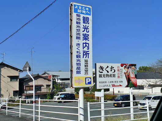 長い下り坂の道がようやく終わって、菊池市街地へ入る手前まで来たら、観光案内所と書かれた看板が見えてきたので、ここを右折して駐車場に車を停めました。