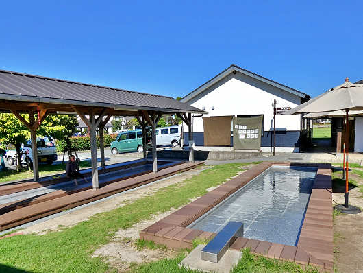 駐車場に車を停めたらさっそく物産館へと向かいましたが、まず見えてきたのが無料の足湯です。ここには長さが10m以上はありそうな大きな足湯が二つあって、左側の足湯には屋根もあったので、猛暑の日や雨天でも快適に利用できそうでした。