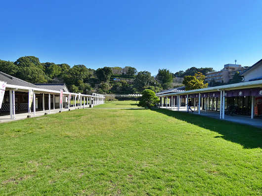 足湯の先にはこの様な広い緑地があって、左側には「きくち観光物産館」があって、右側には観光案内所などが入っている「菊池観光交流館」があります。そして正面に見える樹木が繁った丘のようなところには「菊池神社」があります。