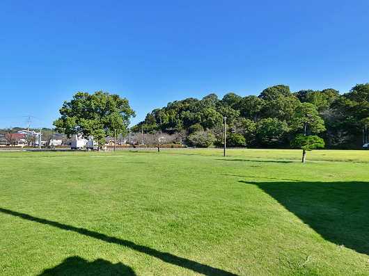 ここには物産館に隣接して広大な芝生広場があって、この広場は「菊池市ふるさと創生市民広場」と「菊池市営中央グラウンド」というそうですが、市街地の中心部にこんな広い緑地や、広い無料駐車場があるところって珍しいですね。