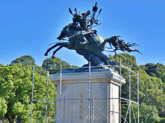 芝生広場には甲冑姿で馬に乗った武者の像もありました。この武者は「菊池武光」といって、南北朝時代の菊池氏第15代当主で、九州における南朝の最盛期を築き上げた名将です。