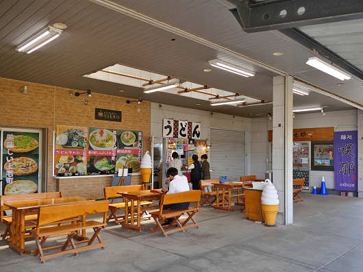 物産館内は撮影NG?なので、物産館の前を通り過ぎて隣接するテイクアウトコーナーへ行きました。ここにはラーメンやうどん、ソフトクリームなどのお店があって、手前の飲食ブースで食事ができるようでした。