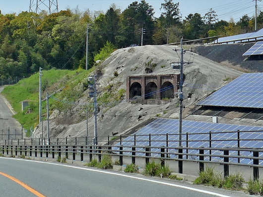 国道322号をしばらく走ったら、県道443号へと右折してさらに先へ進むと、道路沿いのソーラーパネルが並べられた斜面に不思議な構造物が見えてきました。これは「共同石炭鉱業 日吉炭鉱 巻揚機台座」という炭坑の遺構ですが、筑豊地域はかつて筑豊炭田によって栄えたところなので、至る所に炭鉱の遺構があるんですよね。
