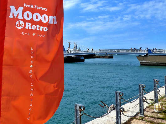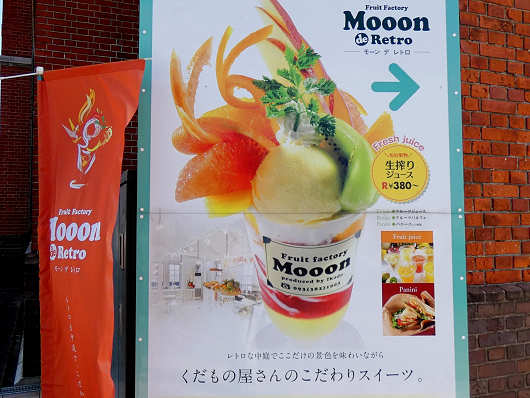 税関広報展示室へ入らずに横へ廻ってみると、赤煉瓦の壁面にはスイーツの大きな写真が載ったフルーツファクトリー「Moon de Retro(モーン デ レトロ」と書かれたカフェの看板がありました。