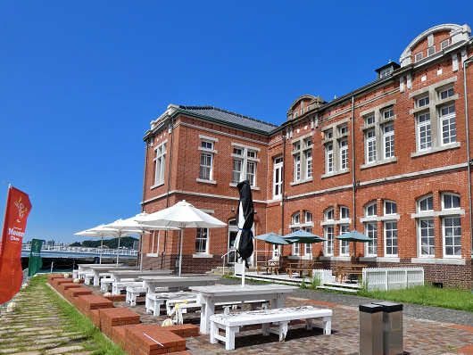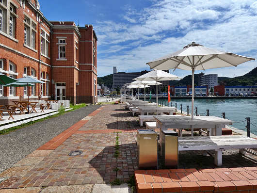 建物の裏手へ廻ってみるとこんな感じで、岸壁とレトロな建物の間にはズラリとテラス席が並んでいました。何だかヨーロッパの街角を見ているような気もする、門司港レトロらしい素敵な光景ですね。