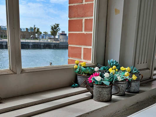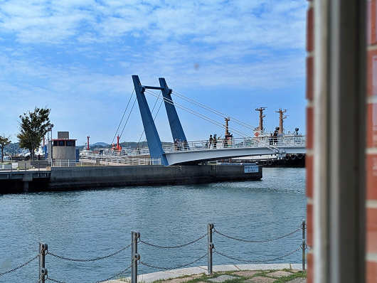 そして店内からも「ブルーウィング もじ」が見えました。でも跳ね橋が上昇し始めたのはお店を出て20分ほど経ってからだったので、この窓の外側から撮影したんですよね。
