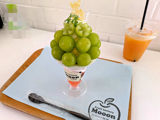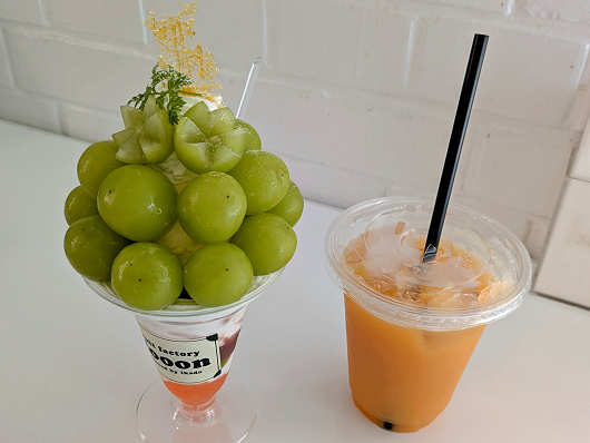 ここで注文したのは、りゅうママは左側の今が旬のシャインマスカットが山盛りになった「シャインマスカットパフェ」で、私が注文したのは右側の「100%桃ジュース」です。私はお昼ご飯でお腹がいっぱいになったのでドリンクを飲むのが精一杯でした(笑)