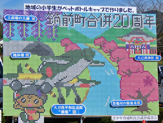 ここには地元の小学生がペットボトルキャップで作った大きな看板もありました。筑前町は2005年に夜須町(やすまち)と三輪町(みわまち)が対等合併してできた新しい町で、今年は合併20周年になるんですよね。