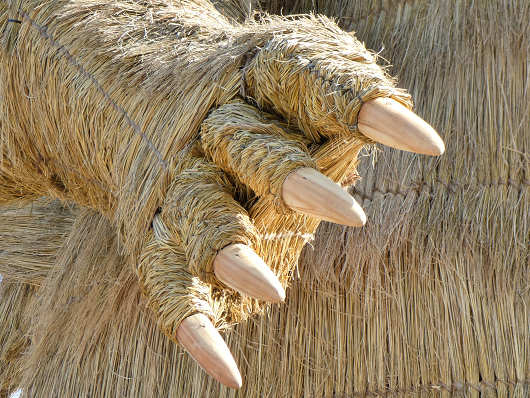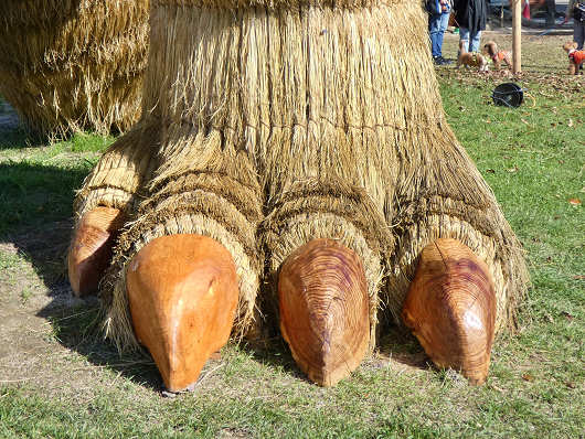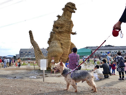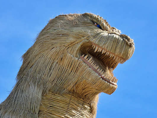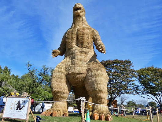 横から眺めたゴジラです。この藁で作られたゴジラは高さが10mで重さは5.7tもあって、従来のわらかがしの2.5倍もの藁を使って作られたそうです。