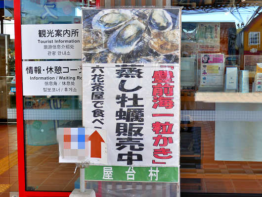 駐車場に車を停めてトイレに行こうとしたら、情報・休憩コーナーの入口には ゛豊前海一粒かき 蒸し牡蠣販売中 ゛の貼り紙がありました。今季はまだ一度も牡蠣を食べてないし、この日は朝ごはんも食べずに早朝にお家を出発したので、ここで朝昼ご飯に蒸し牡蠣でも食べようかと、六花茶屋の入っている「お食事処 屋台村」へ行きましたが・・・