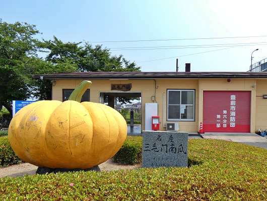 管理人さんの許可も貰ったので、車を停めたらさっそく駅舎の周辺を見て廻りました。今回ここを訪れた目的は、駅前にあるこの「名産 三毛門南瓜(みけかどかぼちゃ)」の大きなモニュメントです。