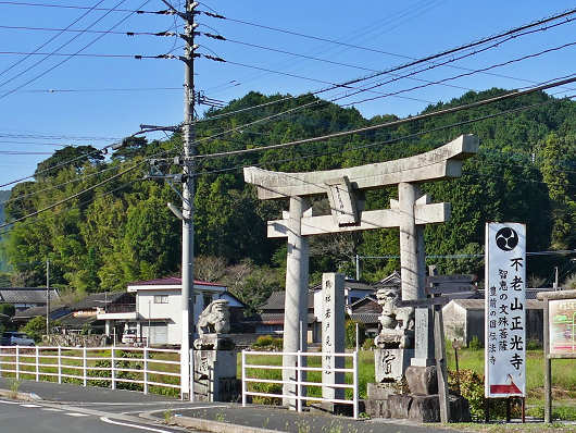 旧蔵内邸を通り過ぎてさらに先へ進むと、次の目的地で1万本の白い彼岸花が咲く「不老山 正光寺(ふろうやま しょうこうじ)」の看板と、その横に鳥居が見えてきました。正光寺へはこの鳥居を車で潜って狭い参道を通っても行けるようですが、ここから200mほど先へ進んだところにはUターンするように右折する車道があるのでそちらへと向かいました。
