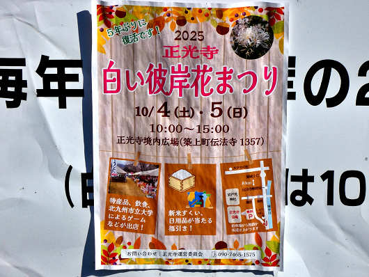 駐車場の入口には「正光寺 白い彼岸花まつり」と書かれたポスターが貼られていましたが、日付を見ると祭りは先週の土、日曜日にすでに開催されていました。
