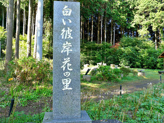 本堂の横には「白い彼岸花の里」と刻まれた石碑がありましたが、石碑の周辺の彼岸花はすでに花の時季を過ぎて枯れていました。