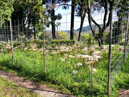 ここではイノシシなどの食害防止の為に全ての彼岸花はこの様な金網の柵で覆われていて、通路から金網越しに観賞することになります。柵には扉もあったので祭りの時などは開放してるのかも知れませんね。